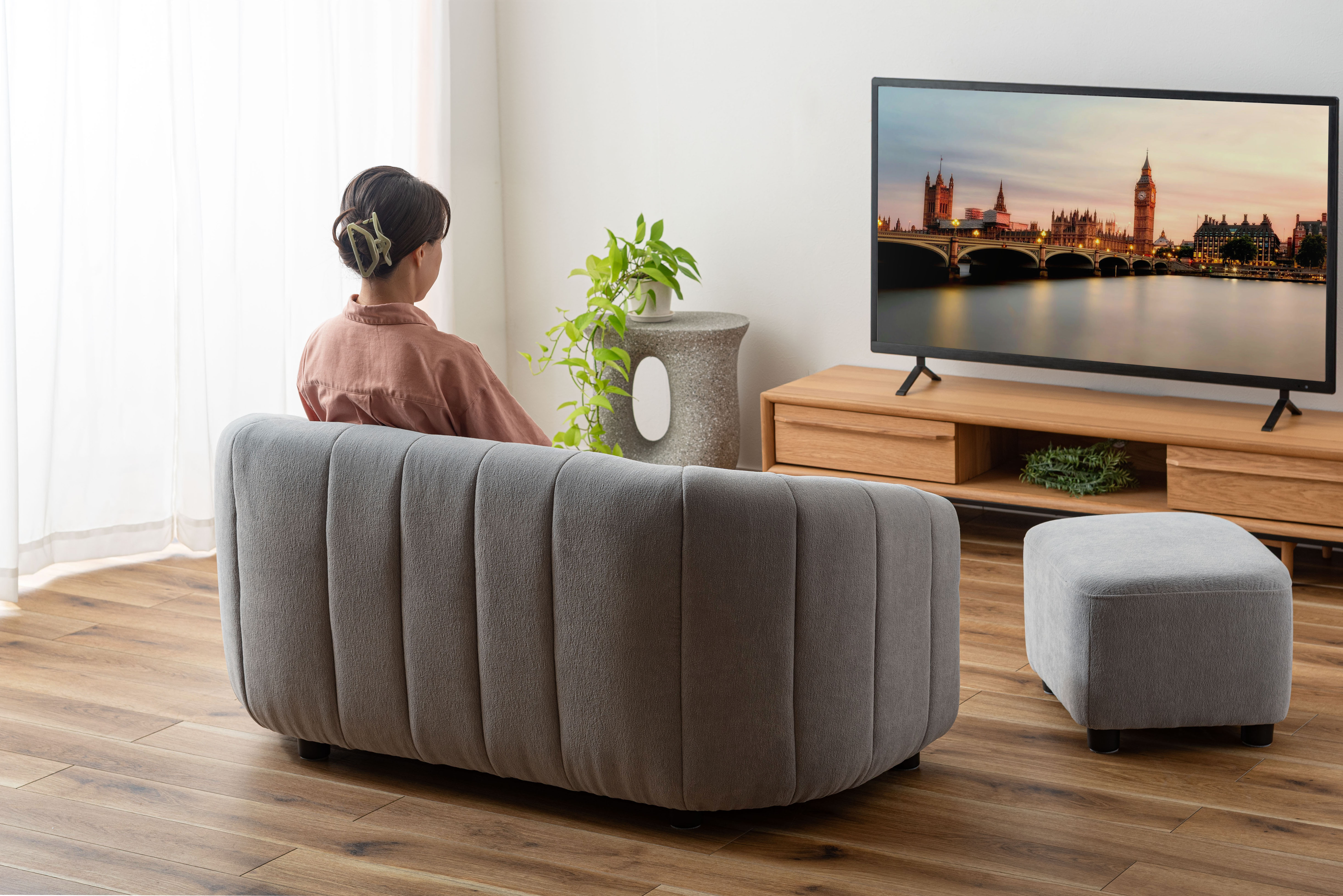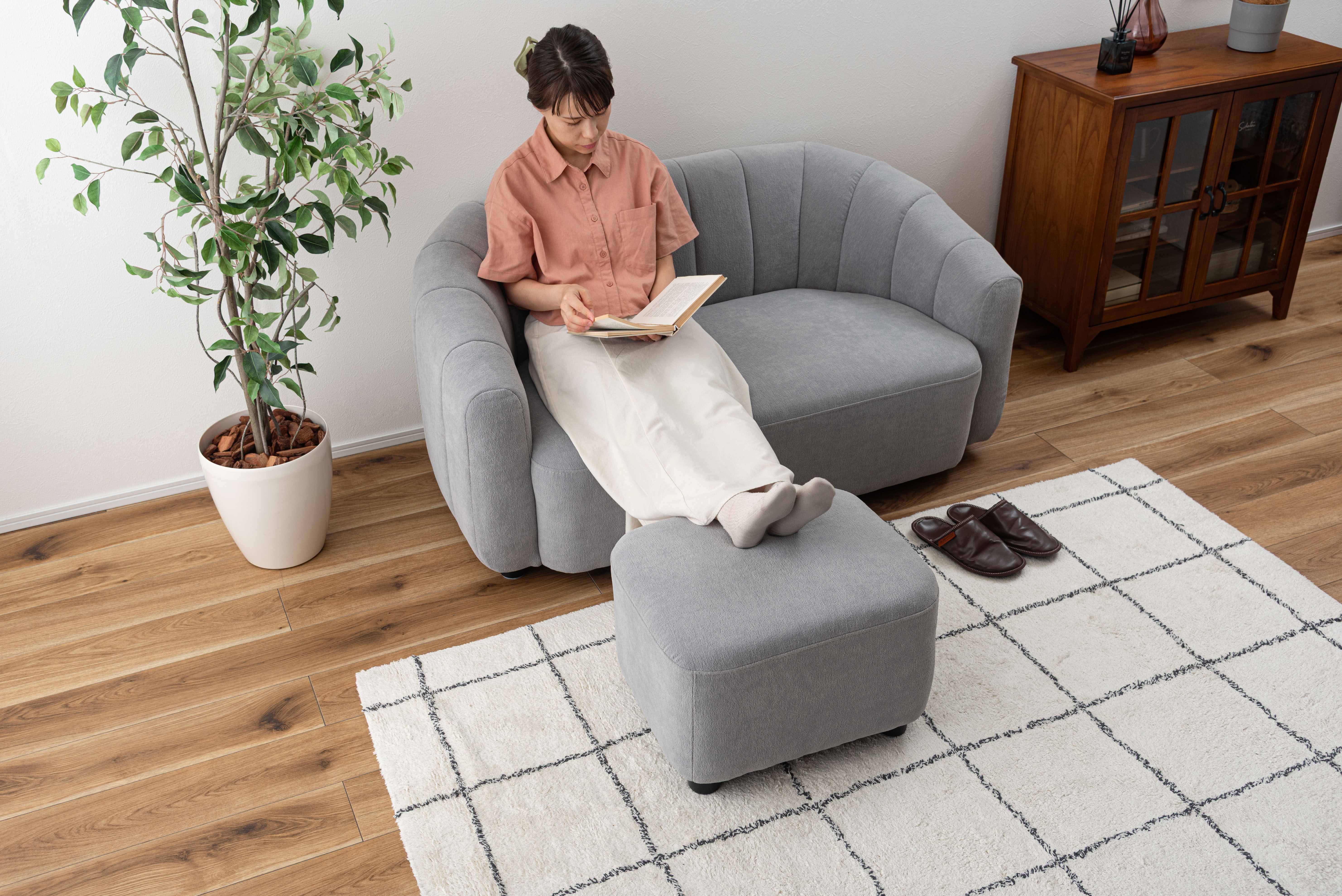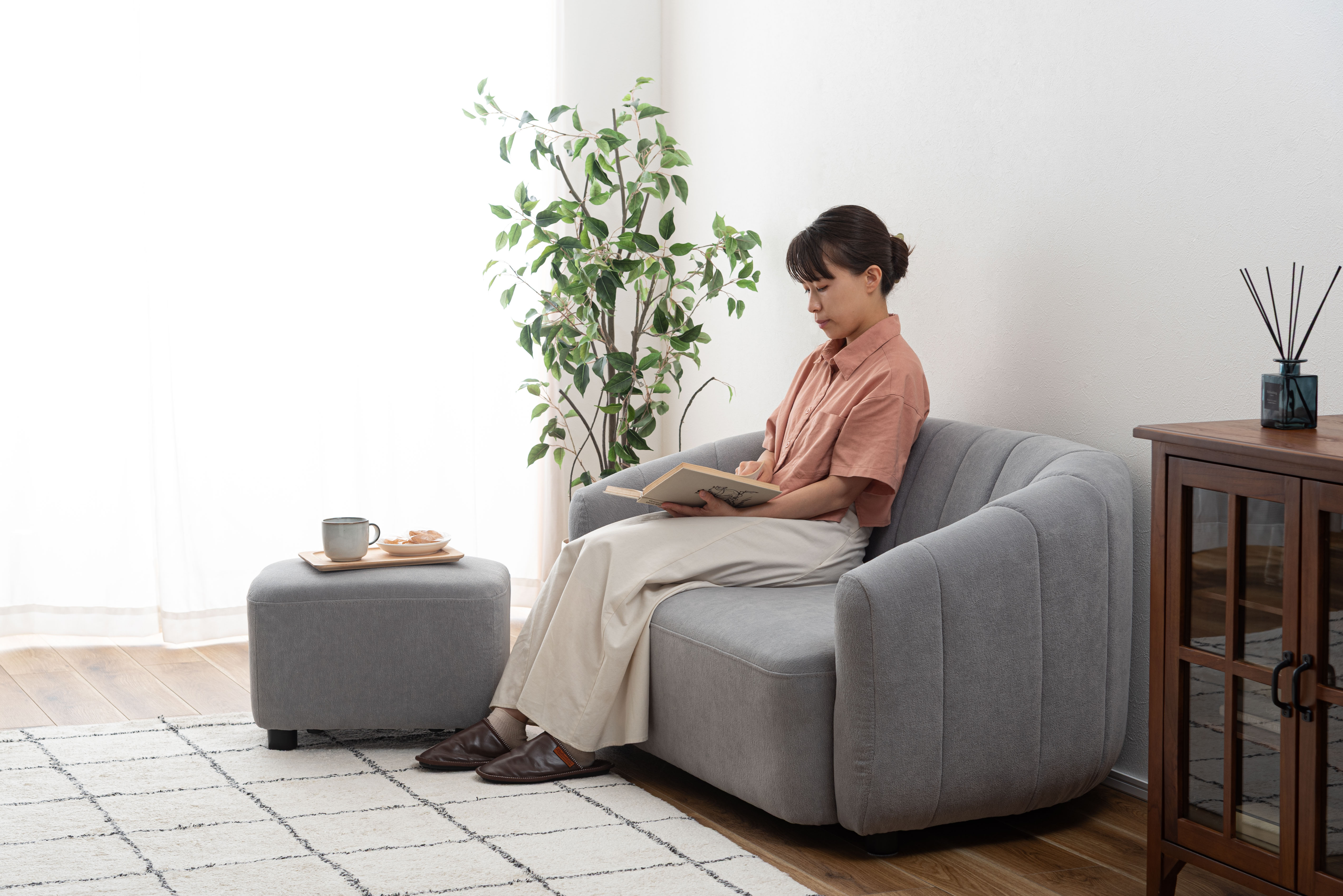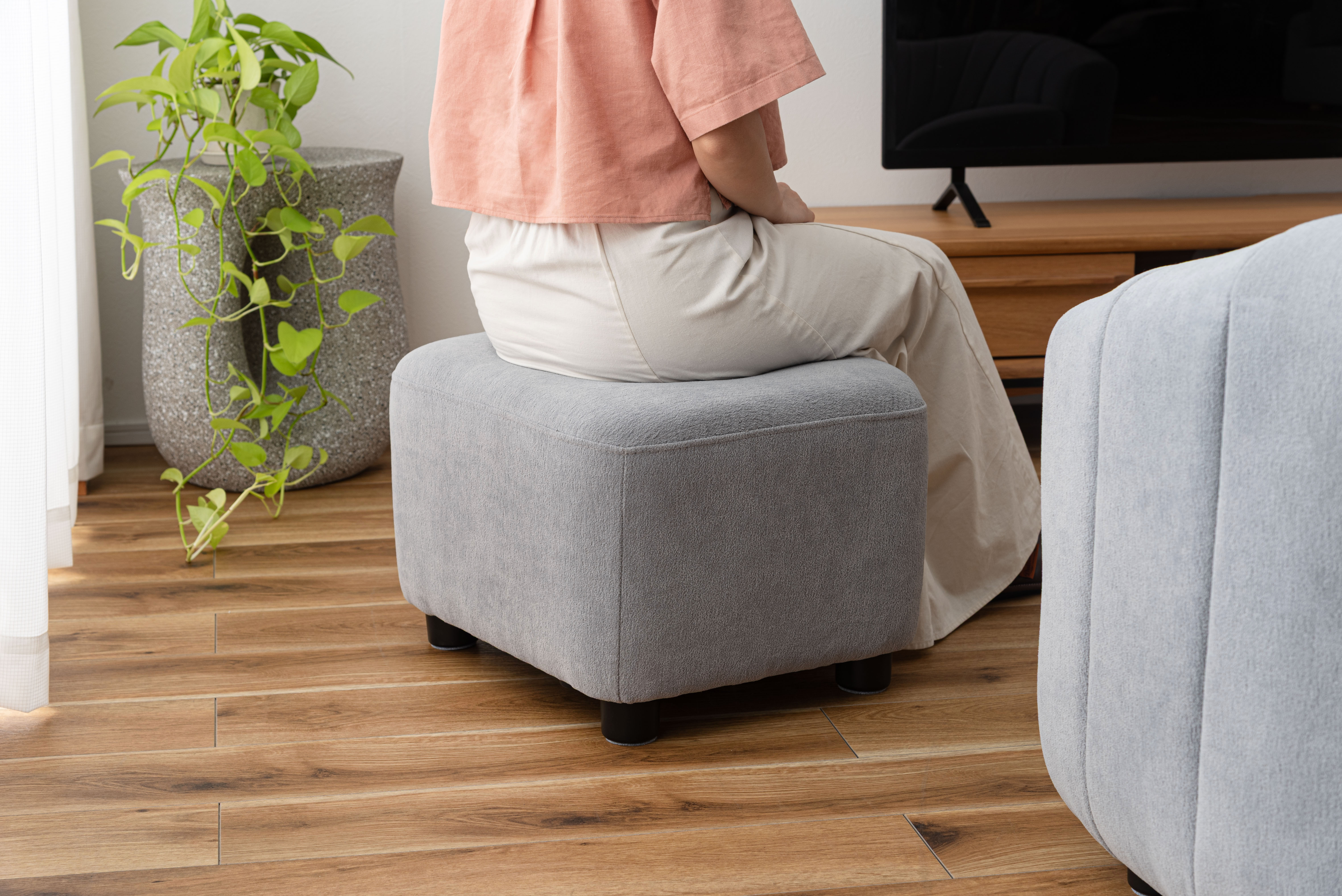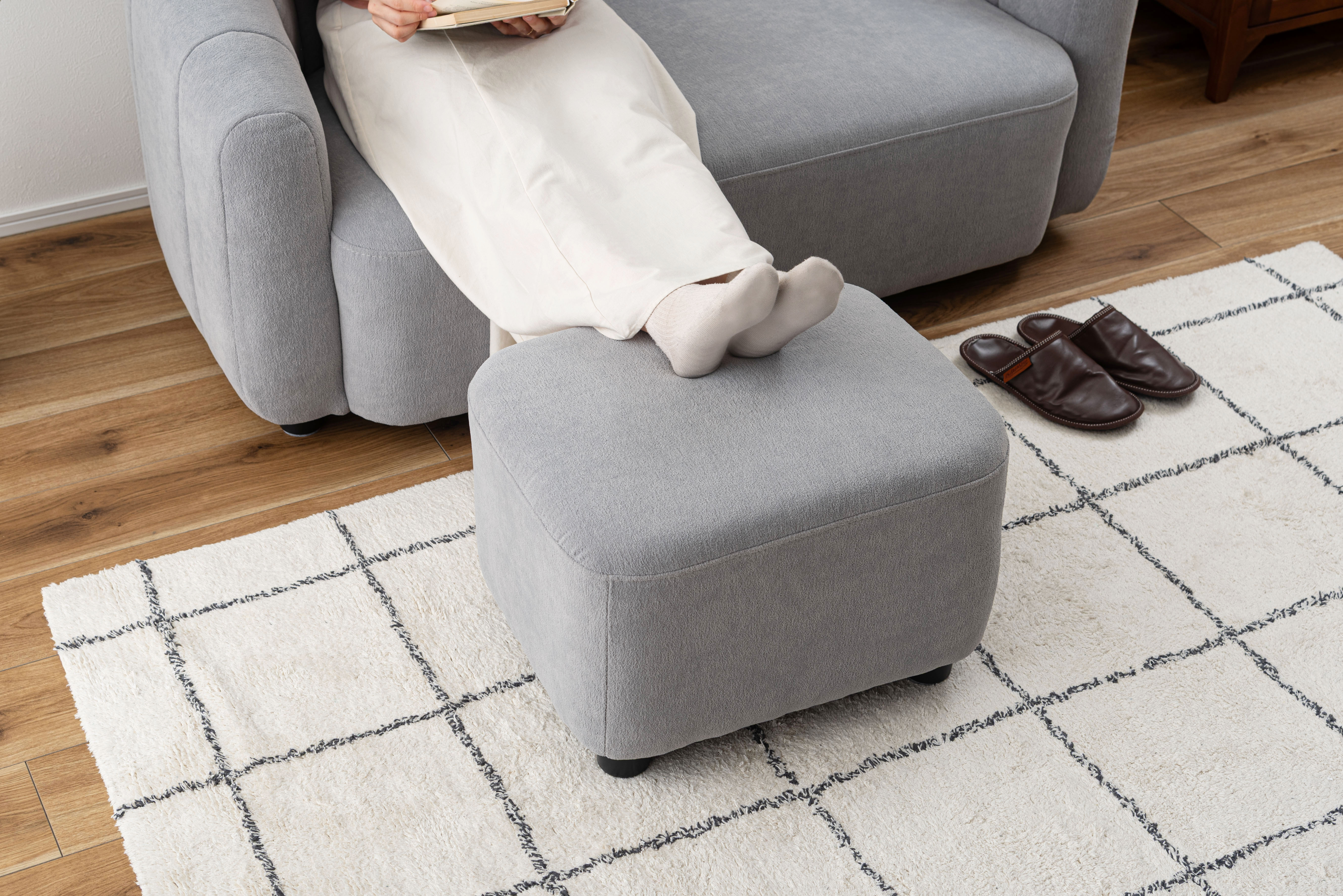 ソファと同じ素材のオットマンはスツールとしても活用でき、シーンに応じて使い分けができます。