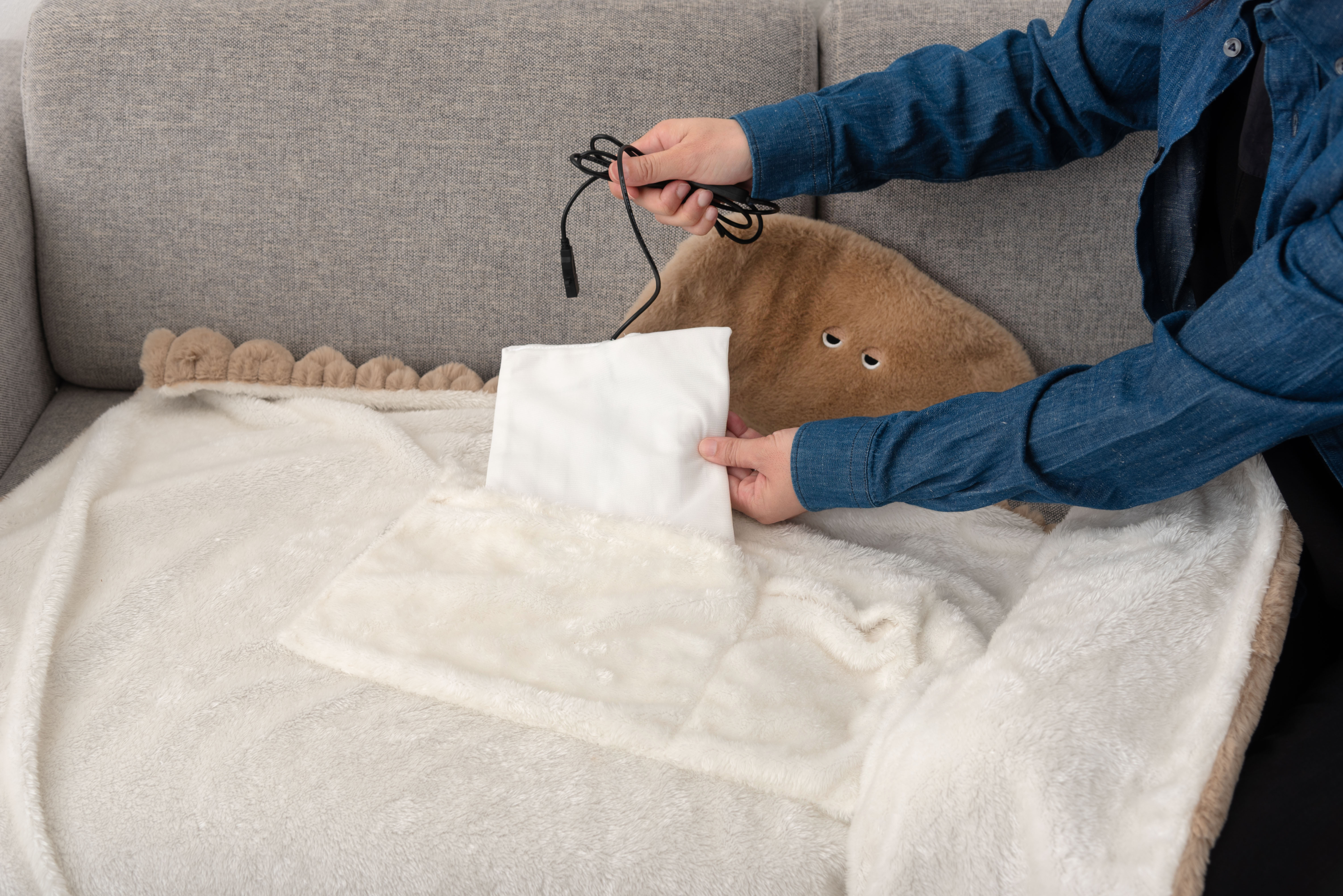 モバイルバッテリーやUSB電源に接続するだけで収納されているヒーターが温まり、取り出しが可能◎カバーを丸洗いすることができます。