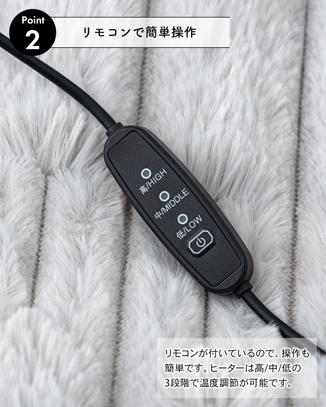 リモコンで簡単操作でき、ヒーターは3段階の調節が可能。