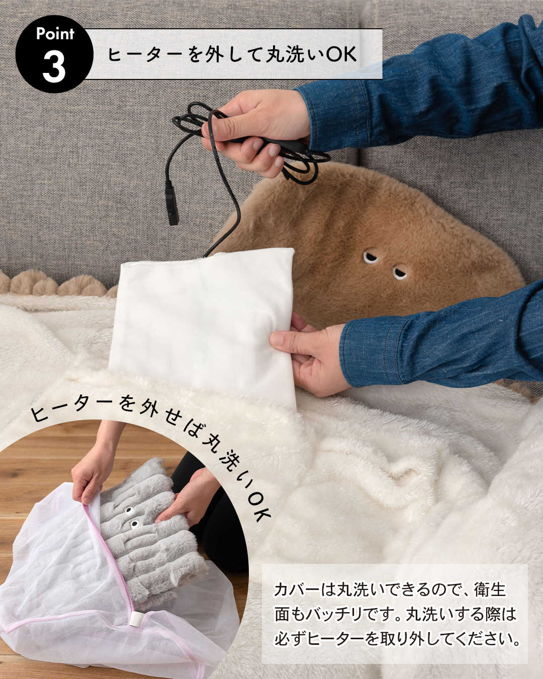 モバイルバッテリーやUSB電源に接続するだけで収納されているヒーターが温まり、取り出しが可能◎カバーを丸洗いすることができます。