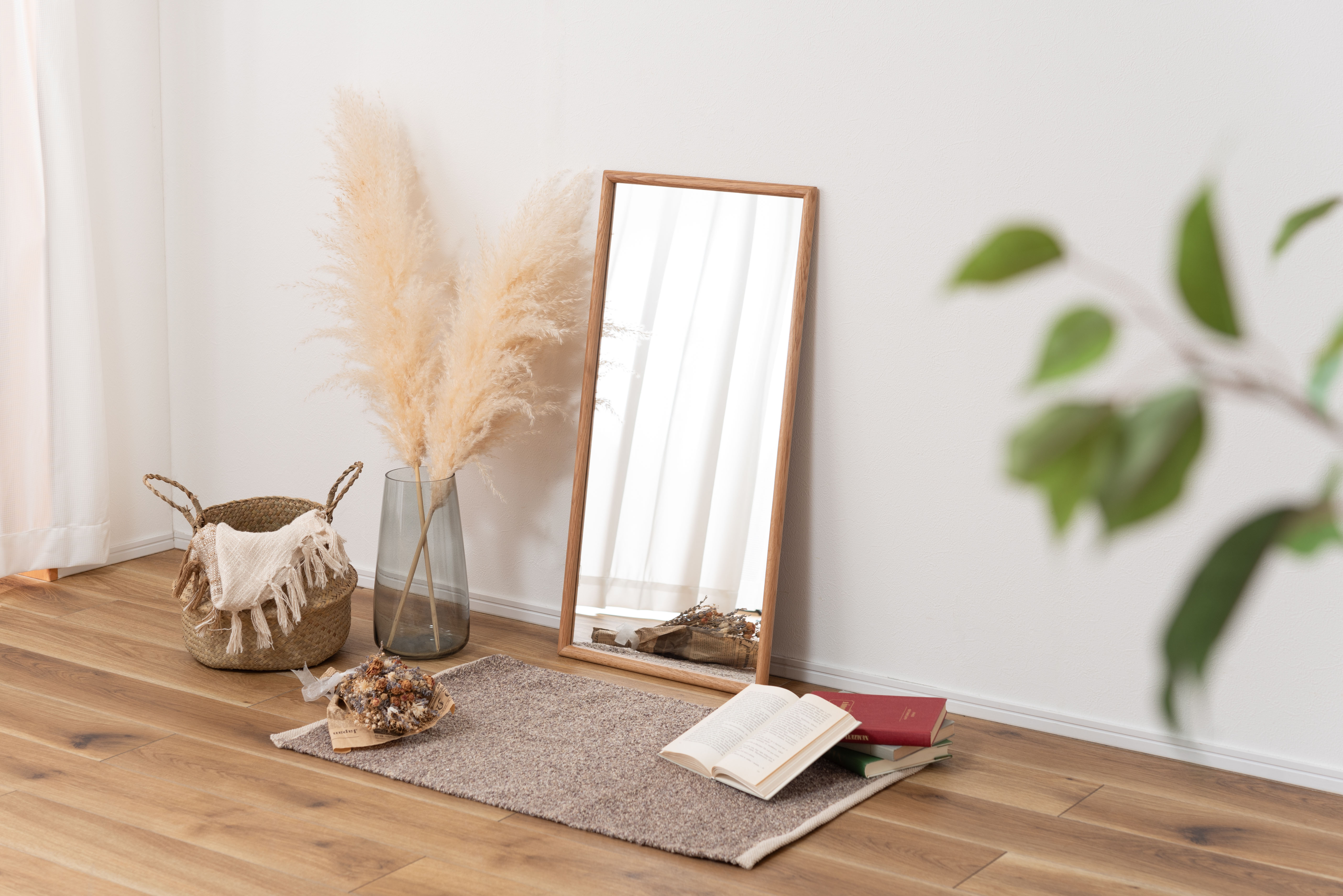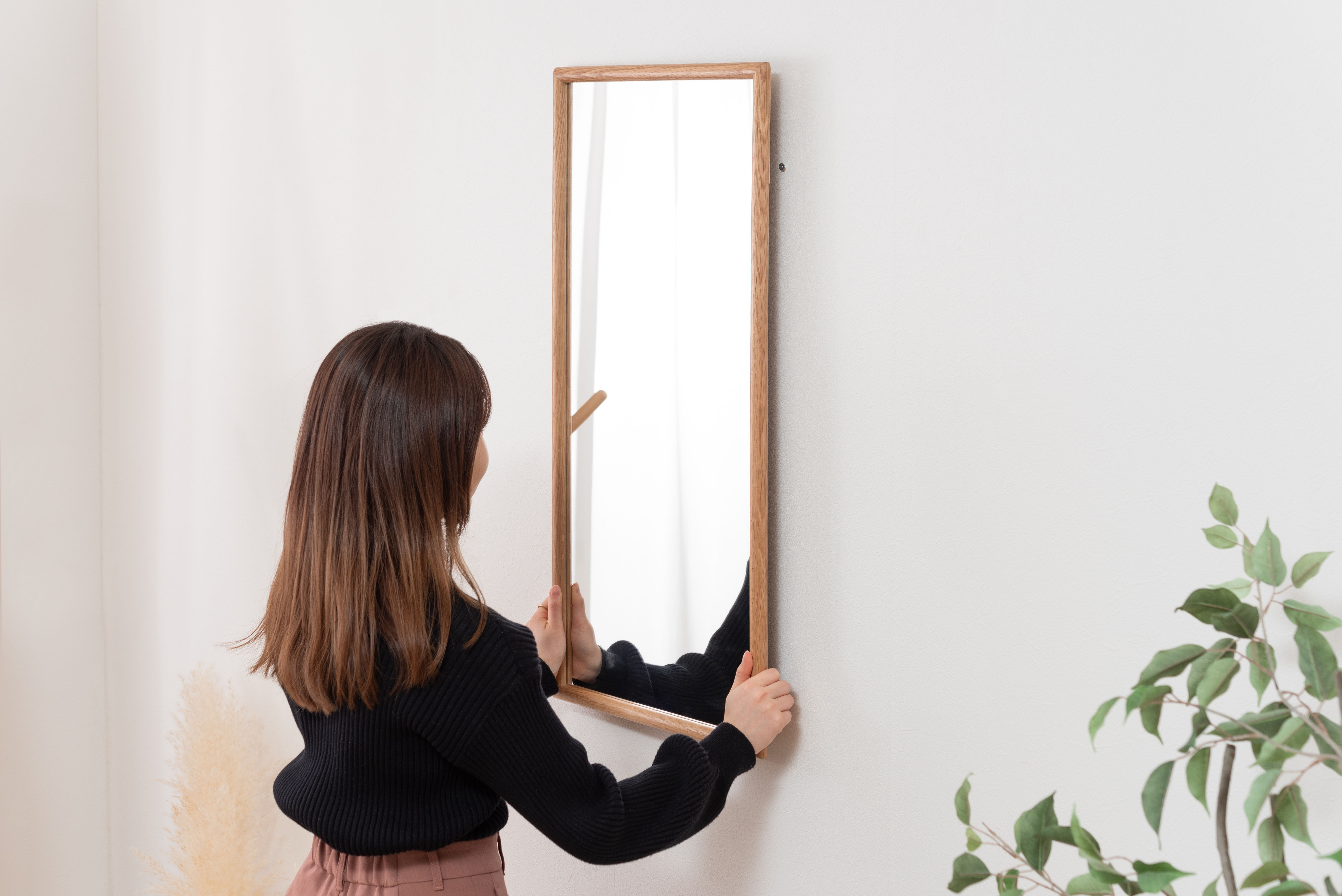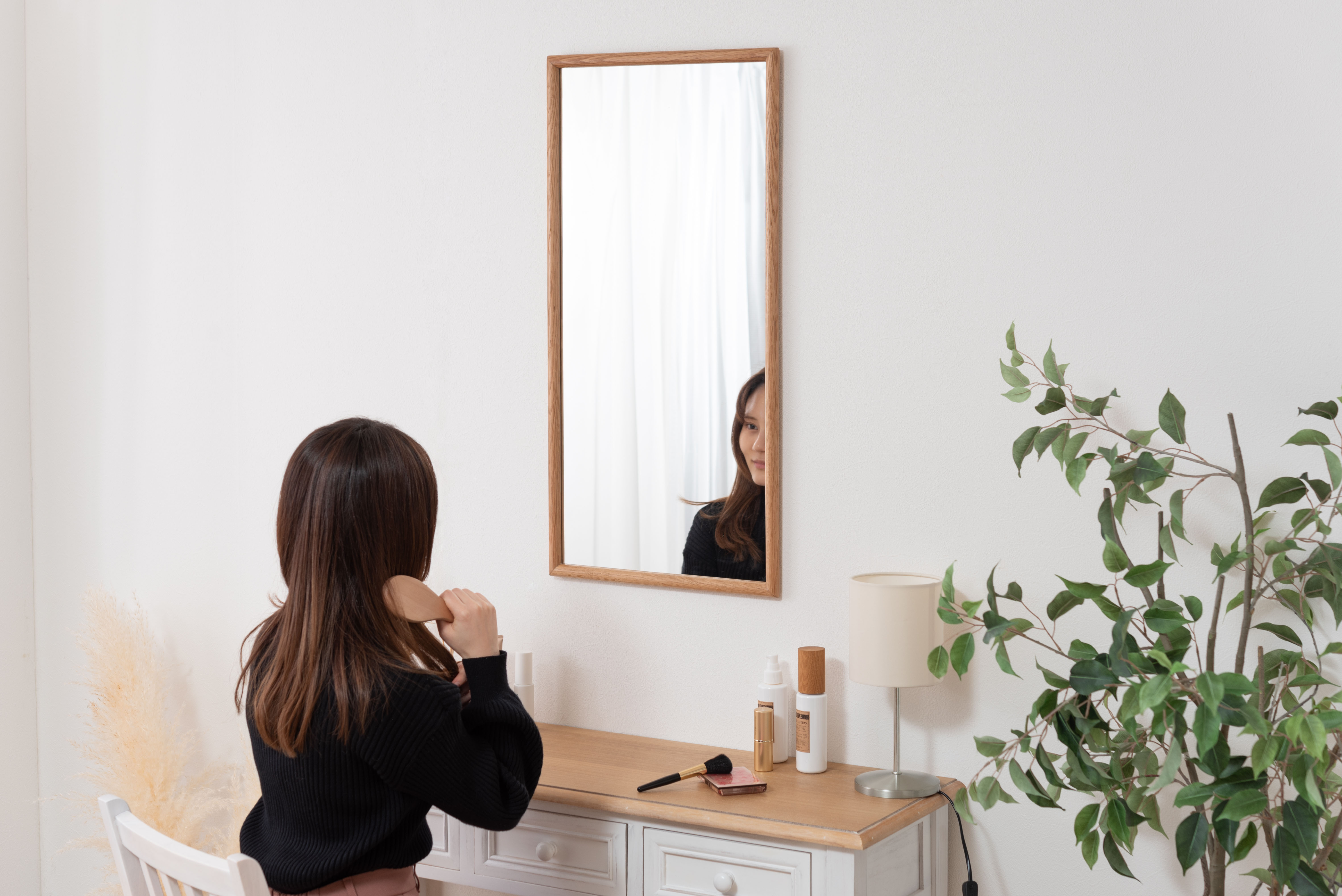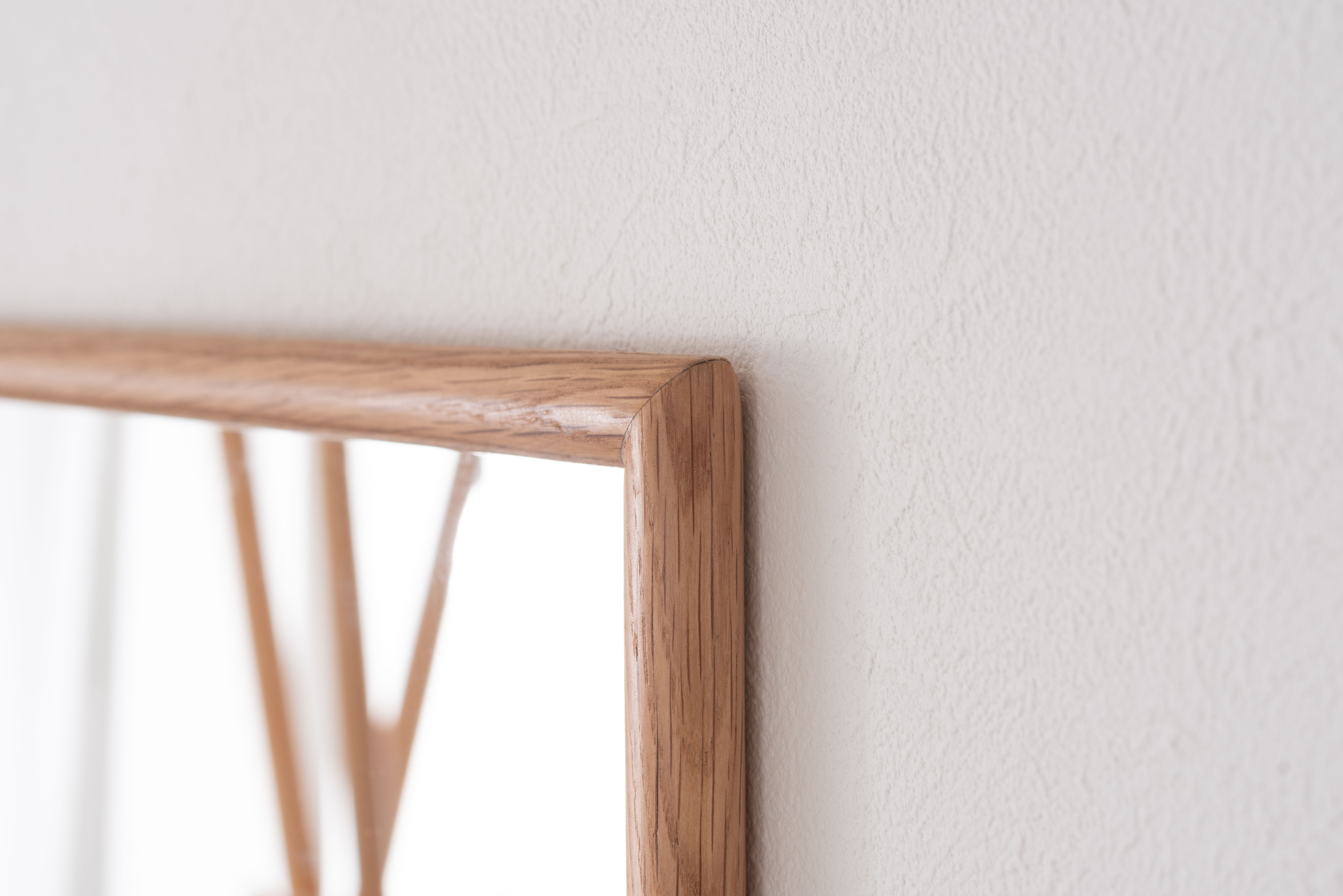 空間に自然と溶け込むあたたかみのあるオークの天然木を贅沢に使用したウォールミラー。