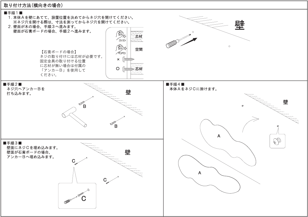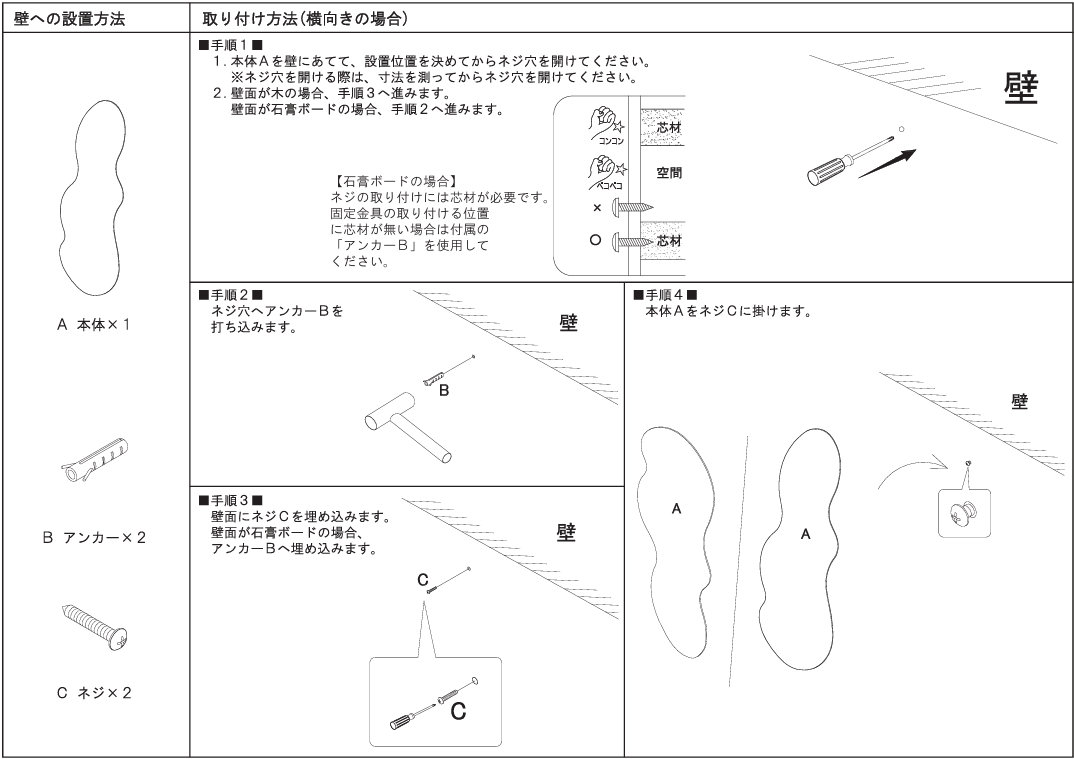 ネジとアンカーの付属部品付きで縦にも横にも自由に設置!