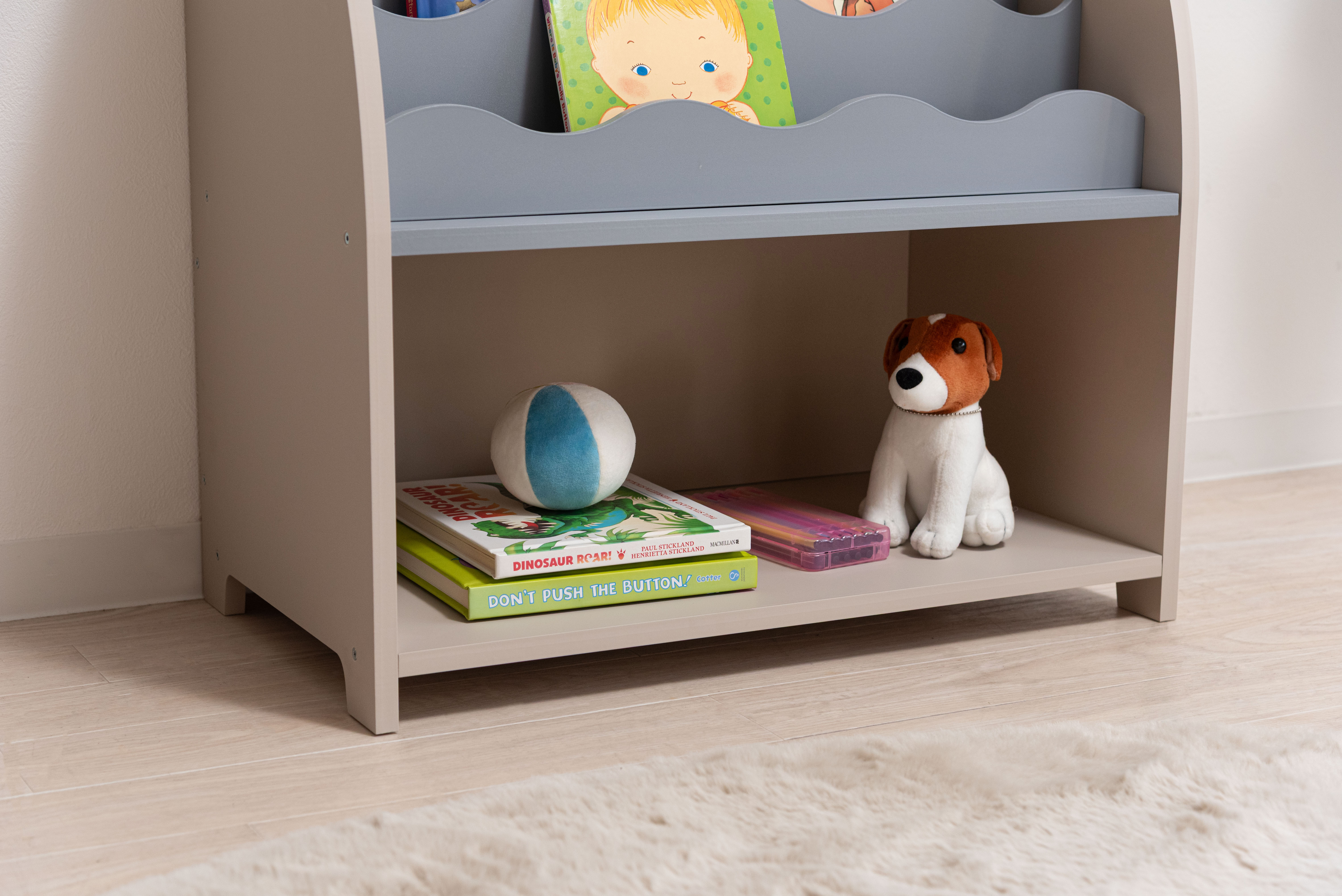 上段にはお気に入りの本を、下段にはおもちゃやバスケット等を自由に収納できます。