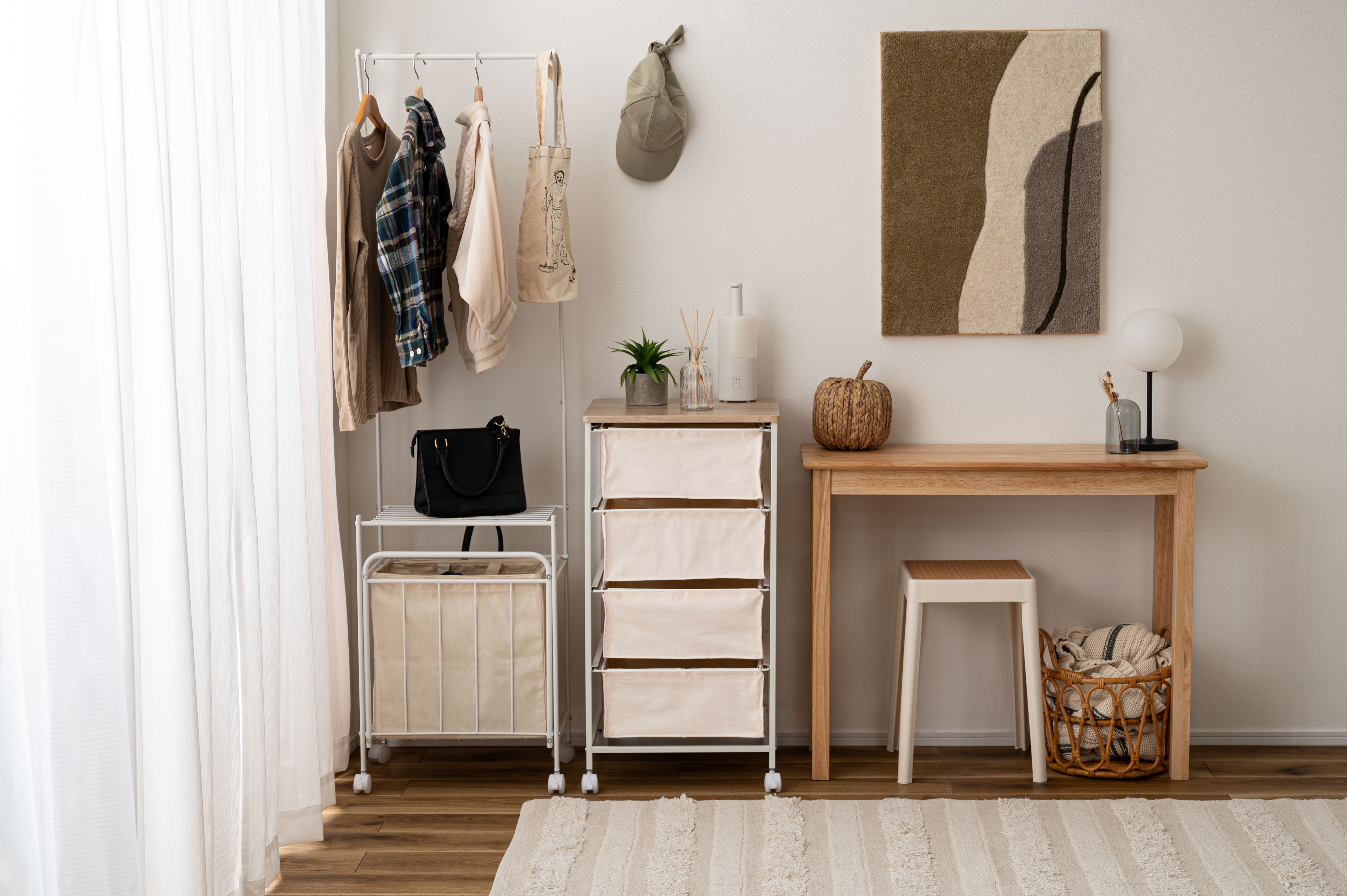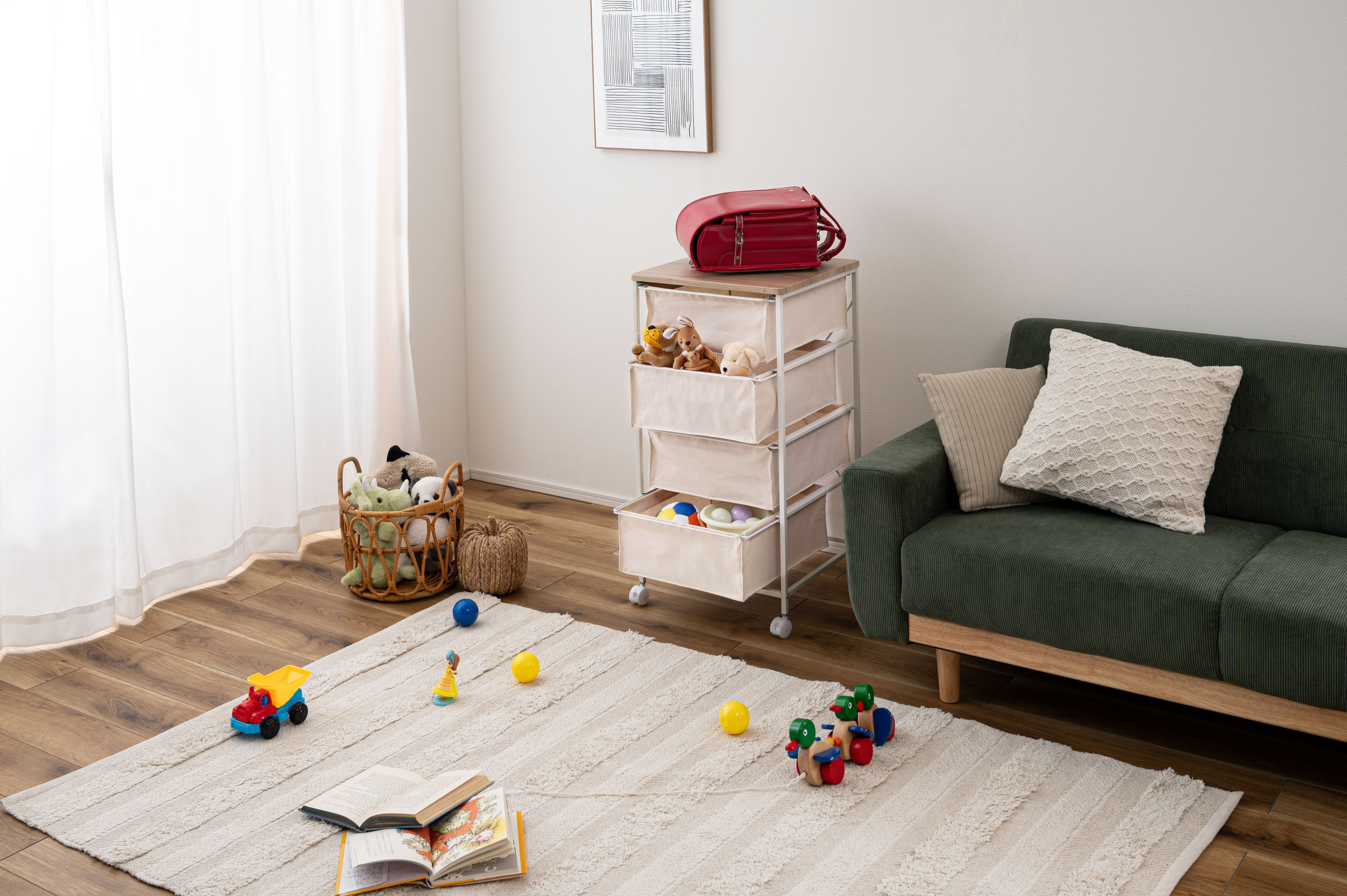 リアルな木目調天板で収納+オシャレ空間を実現。