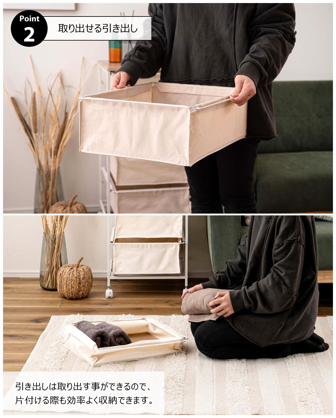 引き出しの底面には丈夫で取り出し可能なMDF板付き。キャンバス地でも形が崩れにくい仕様になっています。