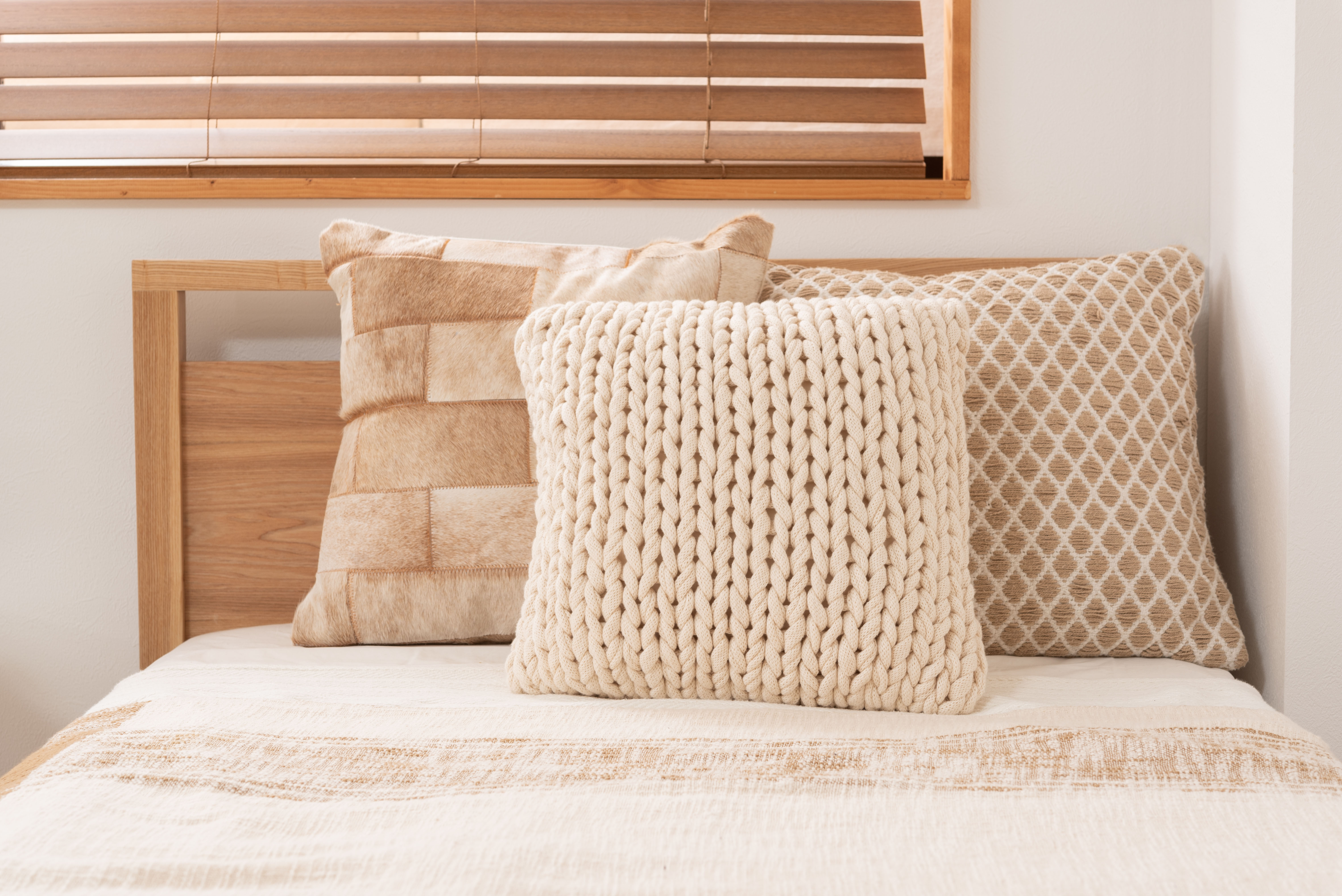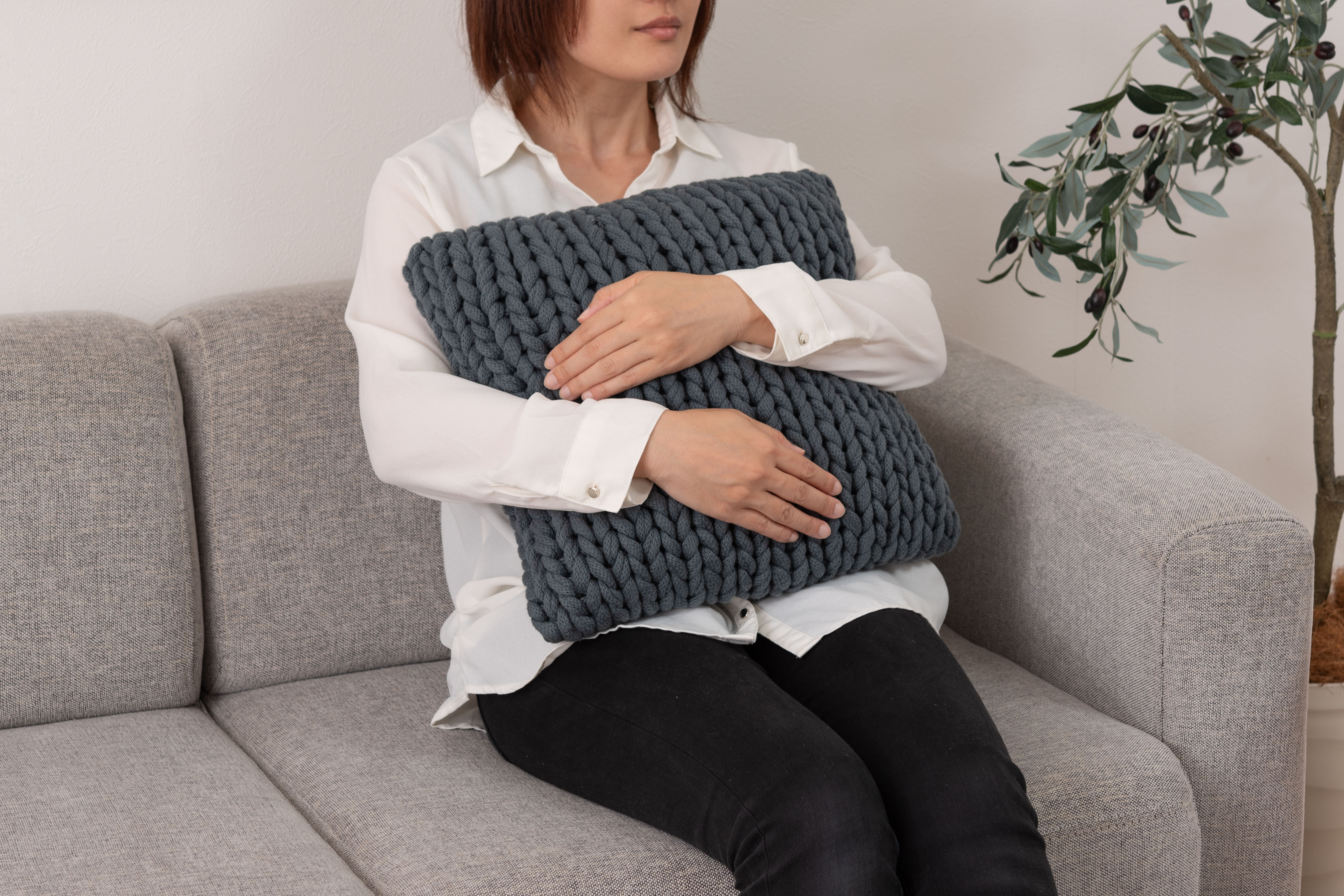 それはまるでニットのように丁寧に編み込まれたカバーリングが印象的なクッション。